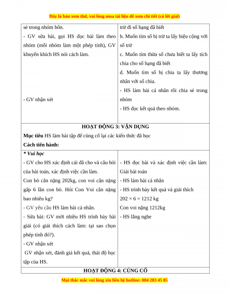 - Củng cố ý nghĩa của phép trừ, tên gọi các thành phần trong các phép cộng, trừ, nhân,