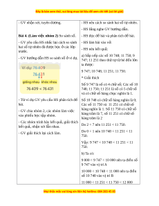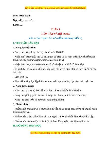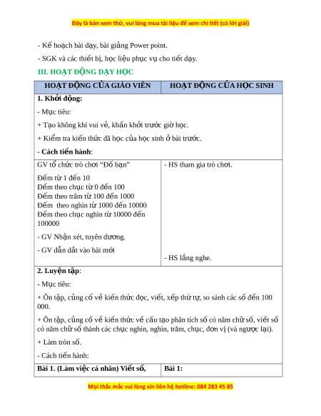 - So sánh hai số có năm ch s ữ , s ố p x ắ p ế các s có năm ố chữ s t ố heo th t ứ t ự bé ừ đ n l ế n. ớ - Làm tròn s . ố - Phát tri n năng ể l c l ự p l ậ u n, ậ t duy t ư oán h c và năng ọ l c gi ự ao ti p t ế oán h c ọ 2. Năng l c chung ự : - Năng l c t ự ch ự , ủ t h ự c: ọ l ng ắ nghe, tr l ả i ờ câu h i ỏ , làm bài t p. ậ - Năng l c gi ự i ả quy t ế v n đ ấ và s ề áng t o: ạ tham gia trò ch i ơ , v n d ậ ng. ụ - Năng l c gi ự ao ti p và ế h p t ợ ác: ho t ạ đ ng ộ nhóm. 3. Phẩm ch t ấ : - Ph m ẩ ch t ấ nhân ái: Có ý th c gi ứ úp đ l ỡ n nhau t ẫ rong ho t ạ đ ng nhóm ộ đ hoàn ể thành nhi m ệ v . ụ - Ph m ẩ ch t ấ chăm ch : ỉ Chăm ch s ỉ uy nghĩ, tr l ả i ờ câu h i ỏ ; làm t t ố các bài t p. ậ - Ph m ẩ ch t ấ trách nhi m ệ : Gi t ữ r t ậ t , bi ự t ế l ng nghe, h ắ c ọ t p nghi ậ êm túc. II. Đ D Ồ ÙNG D Y Ạ H C Ọ