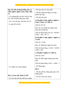 - K ho ế ch ạ bài d y ạ , bài gi ng ả Power point. - SGK và các thi t ế b , h ị c ọ li u ph ệ c ụ v cho t ụ i t ế d y ạ . III. HOẠT Đ N Ộ G D Y Ạ H C Ọ HOẠT Đ N Ộ G C A Ủ GIÁO VIÊN HOẠT Đ N Ộ G C A Ủ H C Ọ SINH 1. Kh i ở đ ng: ộ - M c ụ tiêu: + T o không khí ạ vui v , kh ẻ n kh ấ i ở trư c gi ớ ờ h c. ọ + Ki m ể tra ki n t ế h c đã h ứ c ọ c a h ủ c ọ sinh bài ở trư c. ớ - Cách ti n hành ế : GV tổ ch c t ứ rò ch i ơ “Đố b n” ạ - HS tham gia trò ch i ơ . Đ m ế t 1 đ ừ n ế 10 Đ m ế theo ch c ụ t 0 đ ừ n 100 ế Đ m ế theo trăm t 100 đ ừ n 1000 ế Đ m