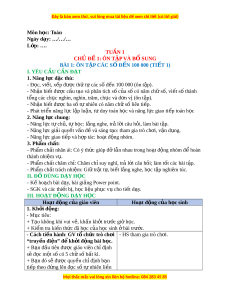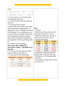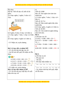 ụ nghìn, nghìn, trăm, ch c ụ và đ n v ơ ( ị ôn t p) ậ . - Nh n bi ậ t ế được ba số t nhi ự ên có năm ch s ữ l ố iên ti p. ế - Phát tri n năng ể l c l ự p l ậ u n, ậ t duy t ư oán h c và năng ọ l c gi ự ao ti p t ế oán h c ọ 2. Năng l c chung ự : - Năng l c t ự ch ự , ủ t h ự c: ọ l ng ắ nghe, tr l ả i ờ câu h i ỏ , làm bài t p. ậ - Năng l c gi ự i ả quy t ế v n đ ấ và s ề áng t o: ạ tham gia trò ch i ơ , v n d ậ ng. ụ - Năng l c gi ự ao ti p và ế h p t ợ ác: ho t ạ đ ng ộ nhóm. 3. Phẩm ch t ấ : - Ph m ẩ ch t ấ nhân ái: Có ý th c gi ứ úp đ l ỡ n nhau t ẫ rong ho t ạ đ ng nhóm ộ đ hoàn ể thành nhi m ệ v . ụ - Ph m ẩ ch t ấ chăm ch : ỉ Chăm ch s ỉ uy nghĩ, tr l ả i ờ câu h i ỏ ; làm t t ố các bài t p. ậ - Ph m ẩ ch t ấ trách nhi m ệ : Gi t ữ r t ậ t , bi ự t ế l ng nghe, h ắ c ọ t p nghi ậ êm túc. II. Đ D Ồ ÙNG D Y Ạ H C Ọ - K ho ế ch ạ bài d y ạ , bài gi ng ả Power point. - SGK và các thi t ế b , h ị c ọ li u ph ệ c ụ v cho t ụ i t ế d y ạ . III. HOẠT Đ N Ộ G D Y Ạ H C Ọ Hoạt đ ng c ộ a g ủ iáo viên Hoạt đ ng c ộ a h ủ c s ọ inh 1. Kh i ở đ ng: ộ - M c ụ tiêu: + T o không khí ạ vui v , kh ẻ n kh ấ i ở trư c gi ớ ờ h c. ọ + Ki m ể tra ki n t ế h c đã h ứ c ọ c a h ủ c ọ sinh bài ở trư c. ớ - Cách ti n hành ế : GV t ch ổ ức trò ch i ơ - HS tham gia trò ch i ơ . “truy n đi ề n” đ ệ kh ể i ở đ ng bài ộ h c. ọ + B n đ ạ u t ầ iên đư c gi ợ áo viên ch đ ỉ nh ị sẽ đ c m ọ t