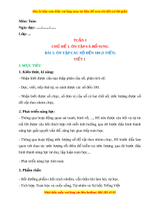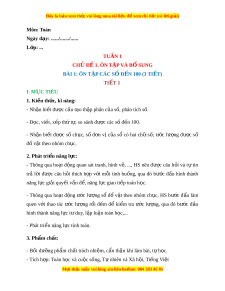 BÀI 1: ÔN TẬP CÁC S Đ Ố N Ế 100 (3 TI T Ế ) TIẾT 1 I. M C Ụ TIÊU 1. Ki n t ế h c, kĩ ứ năng: - Nh n bi ậ t ế được c u t ấ o t ạ h p ậ phân c a s ủ , ố phân tích s . ố - Đ c, vi ọ t ế , x p ế thứ t , s ự o sánh đư c các ợ s đ ố n 100. ế - Nh n ậ bi t ế đư c ợ số ch c, ụ số đ n ơ v ịc a ủ sổ có hai ch ữ s ; ố ư c ớ lư ng ợ đư c ợ số đồ v t ậ theo nhóm ch c. ụ 2. Phát tri n nă ể ng l c: ự - Thông qua ho t ạ đ ng ộ quan sát tranh, hình v , ẽ ..., HS nêu đư c ợ câu h i ỏ và t ự tin trả l i ờ đư c ợ câu h i ỏ thích h p ợ v i ớ m i ỗ tình hu ng, ố qua đó bư c ớ đ u ấ hình thành nãng l c ự gi i ả quy t ế v n đ ấ , năng l ể c gi ự ao ti p ế toán h c. ọ - Thông qua ho t ạ đ ng ộ ư c ớ lư ng ợ sổ đ ổ v t ậ theo nhóm ch c, ụ HS bư c ớ đ u ẩ làm quen v i ớ thao tác ư c ớ lư ng ợ r i ổ đ m ế để ki m ể tra ư c ớ lư ng, ợ qua đó bư c ớ đ u ầ hình thành năng l c ự t duy ư , l p l ậ u n ậ toán h c,... ọ - Phát tri n năng ể l c t ự ính toán. 3. Phẩm ch t ấ : - Bồi dư ng ph ỡ m ẩ ch t ấ trách nhi m ệ , c n t ẩ h n ậ khi làm bài, t h ự c. ọ - Tích h p: ợ Toán h c và cu ọ c ộ s ng, ố T nhi ự ên và Xã h i ộ , Ti ng ế Vi t ệ M i