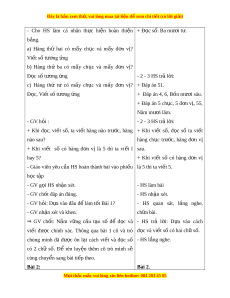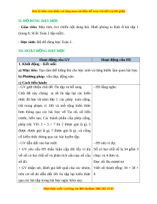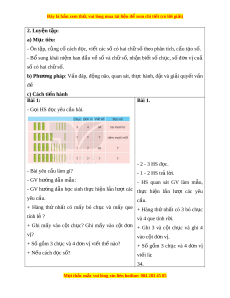 ơ pháp: Vấn đáp, đ ng não, ộ quan sát, th c ự hành, đ t ặ và gi i ả quy t ế v n ấ đề c) Cách ti n h ế ành Bài 1: Bài 1. - G i ọ HS đ c yêu ọ c u bài ầ . - 2 - 3 HS đ c. ọ - Bài yêu c u l ầ àm gì? - 1 - 2 HS trả l i ờ . - GV hư ng d ớ n m ẫ u: ẫ - HS quan sát GV làm m u, ẫ - GV hư ng d ớ n ẫ h c ọ sinh th c ự hi n ệ l n ầ lư t ợ các th c ự hi n ệ l n ầ lư t ợ các yêu yêu cầu. cầu. + Hàng thứ nh t ấ có m y ấ bó ch c ụ và m y ấ que + Hàng thứ nh t ấ có 3 bó ch c ụ tính l ? ẻ và 4 que tính r i ờ . + Ghi m y ấ vào c t ộ ch c ụ ? Ghi m y ấ vào c t ộ đ n ơ + Ghi 3 và c t ộ ch c ụ và ghi 4 vị? vào c t ộ đ n ơ v .ị + Số gồm 3 ch c ụ và 4 đ n v ơ vi ị t ế th nào? ế + Số gồm 3 ch c ụ và 4 đ n ơ vị + N u cách ế đ c s ọ ố? vi t ế là: 34. M i