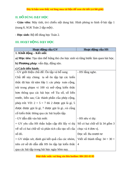 ộ dung bài. Hình phóng to hình ở bài t p ậ 1 (trang 8, SGK Toán 2 t p m ậ t ộ ) . - H c s ọ inh: B đ ộ ồ đùng h c ọ Toán 2. III. HOẠT Đ N Ộ G D Y Ạ H C Ọ Hoạt đ ng c ộ a G ủ V Hoạt đ ng c ộ a H ủ S 1. Kh i ở đ ng – K ộ t ế n i ố : a) M c t ụ iêu: T o t ạ âm th h ế ng ứ thú cho h c s ọ inh và t ng b ừ ư c l ớ àm quen bài h c. ọ b) Phư ng pháp ơ : vấn đáp, đ ng não. ộ c) Cách ti n h ế ành: - GV gi i ớ thi u ch ệ ủ đ : ề Ôn t p và b ậ s ổ ung - HS l ng ắ nghe.