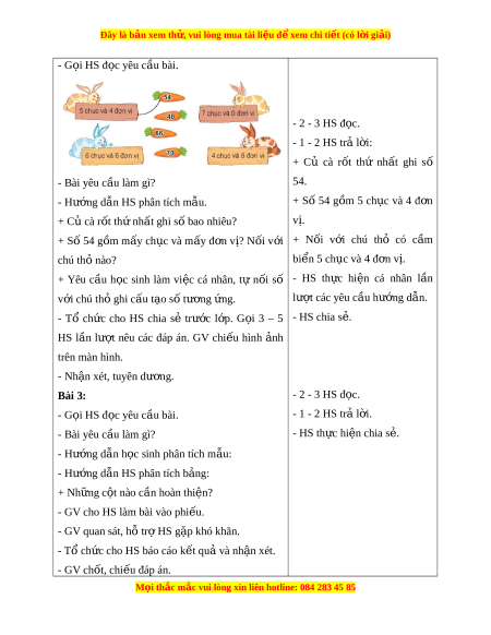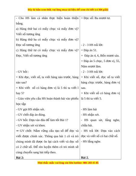 Đây là bản xem th , vu ử i lòng mua tài li u ệ đ xe ể m chi ti t (c ế ó l i ờ gi i ả ) - Cho HS làm cá nhân th c ự hi n ệ hoàn thi n ệ + Đ c s ọ ố: Ba mư i ơ t . ư b ng. ả a) Hàng thứ hai có m y ấ ch c ụ và m y ấ đ n ơ v ? ị Vi t ế số tư ng ơ ng ứ b) Hàng thứ ba có m y ấ ch c ụ và m y ấ đ n ơ v ? ị Đ c ọ số tư ng ơ ng ứ - 2 - 3 HS trả l i ờ : c) Hàng thứ tư có m y ấ ch c ụ và m y ấ đ n ơ v ? ị + Đáp án 51. Đ c, ọ Vi t ế số tư ng ơ ng ứ + Đáp án 4, 6, Bốn mư i ơ sáu. + Đáp án 5 ch c, ụ 5 đ n ơ v ,ị 55, Năm mư i ơ lăm. - GV h i ỏ : - 2 - 3 HS trả l i ờ : + Khi đ c, ọ vi t ế s , ố ta vi t ế hàng nào trư c, ớ hàng + Khi vi t ế s , ố đ c ọ số ta vi t ế nào sau? hàng ch c ụ trư c, ớ hàng đ n ơ vị + Khi vi t ế số có hàng đ n ơ vị là 5 thì ta vi t ế l sau. hay 5? + Khi vi t ế số có hàng đ n ơ vị - Giáo viên yêu c u