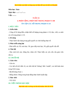 Ngày dạy: ....../ ....../ ...... L p: ớ ......... TUẦN 33 4. PHÉP C N Ộ G, PHÉP TR Ừ TRONG PH M Ạ VI 100 ÔN TẬP CÁC S Ố TRONG PH M Ạ VI 10 I. M C Ụ TIÊU 1. Ki n t ế h c ứ - C ng ủ cố kĩ năng đ m ế , nh n ậ bi t ế s ố lư ng ợ trong ph m ạ vi 10; đ c, ọ vi t ế , so sánh các số trong ph m ạ vi 10. 2. Kĩ năng - Th c ự hành v n d ậ ng t ụ rong gi i ả quy t ế các tình hu ng t ố h c ự t . ế 3. Phát tri n nă ể ng l c ự - Phát tri n các ể NL toán h c: ọ NL giao ti p t ế oán h c, ọ NL gi i ả quy t ế v n đ ấ . ề 4. Thái độ - H c ọ sinh tích c c, ự h ng ứ thú, chăm ch .ỉ Th c ự hi n ệ các yêu c u ầ c a ủ giáo viên nêu ra. II. CHUẨN BỊ 1. Giáo viên: - Giáo án. - Các thẻ số từ 0 đ n ế 10, các th ẻ ch ữ t ừ “không” đ n ế “mư i ờ ”, các th ẻ hình như trong SGK trang - Bộ đồ dùng Toán 1. - B ng ả nhóm: Dùng trong ho t ạ đ ng t ộ h c hành l ự uy n t ệ p. ậ 2. H c ọ sinh: - V , ở SGK III. TI N Ế TRÌNH D Y Ạ H C Ọ M i