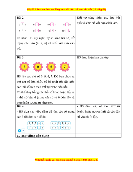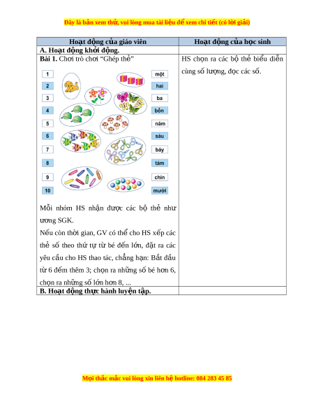 Đây là bản xem th , vu ử i lòng mua tài li u ệ đ xe ể m chi ti t (c ế ó l i ờ gi i ả ) Hoạt đ ng c ộ a gi ủ áo viên Hoạt đ ng c ộ a h ủ c s ọ inh A. Hoạt đ ng k ộ h i ở đ ng. ộ Bài 1. Ch i ơ trò ch i ơ “Ghép th ” ẻ HS ch n ọ ra các bộ thẻ bi u ể di n ễ cùng số lư ng, đ ợ c ọ các số. Mỗi nhóm HS nh n ậ đư c ợ các bộ thẻ như ư ng ơ SGK. N u ế còn th i ờ gian, GV có th ể cho HS x p ế các