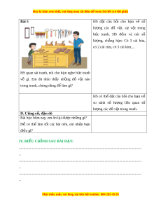 HS quan sát tranh, nói cho b n ạ nghe b c ứ tranh vẽ gì. Em đã nhìn th y ấ nh ng ữ đồ v t ậ nào trong tranh, chúng dùng đ l ể àm gì? HS có thể đ t ặ câu h i ỏ cho b n ạ về so sánh số lư ng ợ liên quan số lư ng các ợ đồ v t ậ trong tranh. D. Củng c , ố d n dò ặ Bài h c hôm ọ nay, em ôn l i ạ đư c nh ợ ng gì ữ ? Để có thế làm t t ố các bài trên, em nh n ắ b n ạ đi u gì ề ? IV. ĐIỀU CH N Ỉ H SAU BÀI D Y Ạ :