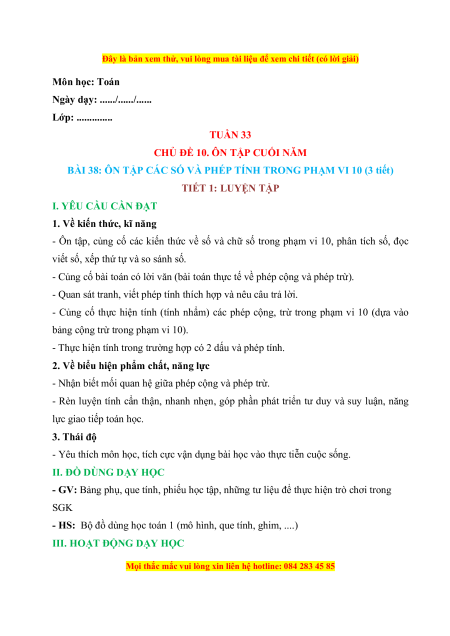 BÀI 38: ÔN TẬP CÁC SỐ VÀ PHÉP TÍNH TRONG PHẠM VI 10 (3 tiết)