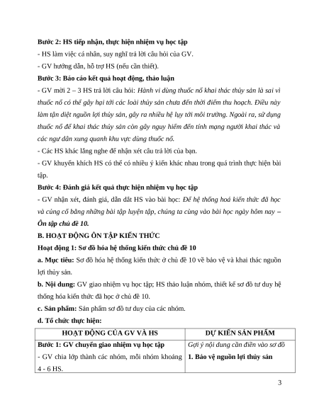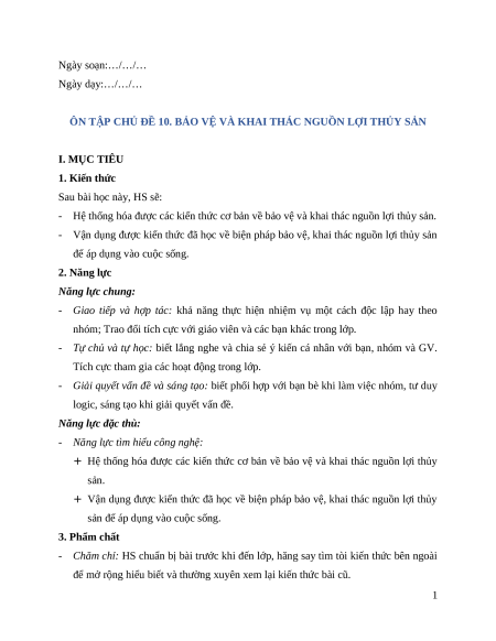 ÔN TẬP CHỦ ĐỀ 10. BẢO VỆ VÀ KHAI THÁC NGUỒN LỢI THỦY SẢN I. MỤC TIÊU 1. Kiến thức Sau bài học này, HS sẽ: