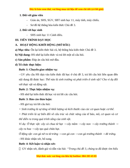 Bộ giáo án Sinh học 11 Cánh diều đã cập nhật đủ Cả năm.