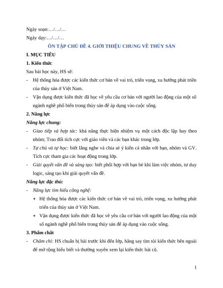 ÔN TẬP CHỦ ĐỀ 4. GIỚI THIỆU CHUNG VỀ THỦY SẢN I. MỤC TIÊU 1. Kiến thức Sau bài học này, HS sẽ: