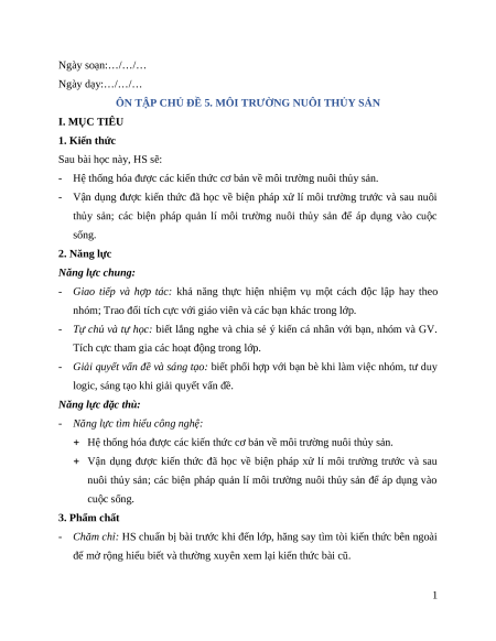 ÔN TẬP CHỦ ĐỀ 5. MÔI TRƯỜNG NUÔI THỦY SẢN I. MỤC TIÊU 1. Kiến thức Sau bài học này, HS sẽ: