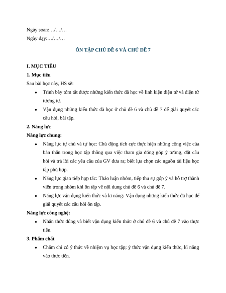 ÔN TẬP CHỦ ĐỀ 6 VÀ CHỦ ĐỀ 7 I. MỤC TIÊU 1. Mục tiêu Sau bài học này, HS sẽ:
