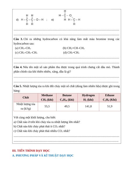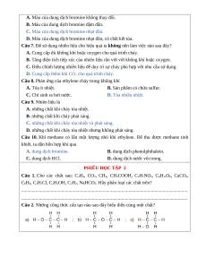Câu 3. Chỉ ra những hydrocarbon có khả năng làm mất màu bromine trong các hydrocarbon sau: (a) CH3–CH3 (b) CH2=CH–CH3
