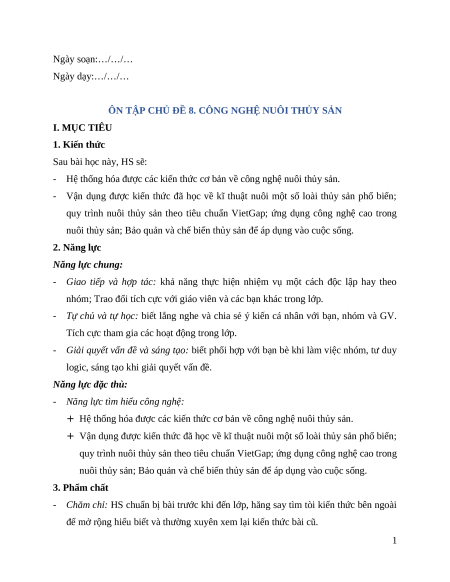 ÔN TẬP CHỦ ĐỀ 8. CÔNG NGHỆ NUÔI THỦY SẢN I. MỤC TIÊU 1. Kiến thức Sau bài học này, HS sẽ:
