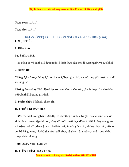BÀI 25: ÔN TẬP CHỦ ĐỀ CON NGƯỜI VÀ SỨC KHỎE (2 tiết) I. MỤC TIÊU 1. Kiến thức Sau bài học, HS: