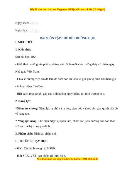 BÀI 9: ÔN TẬP CHỦ ĐỀ TRƯỜNG HỌC I. MỤC TIÊU 1. Kiến thức Sau bài học, HS: