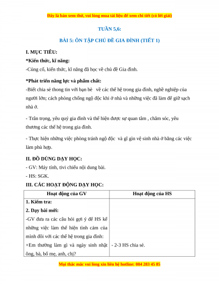 BÀI 5: ÔN TẬP CHỦ ĐỀ GIA ĐÌNH (TIẾT 1) I. MỤC TIÊU: