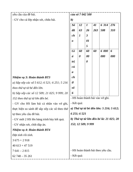 mỗi số đã cho; xếp được các số theo thứ tự từ bé đến lớn hoặc từ lớn đến bé; đặt tính
