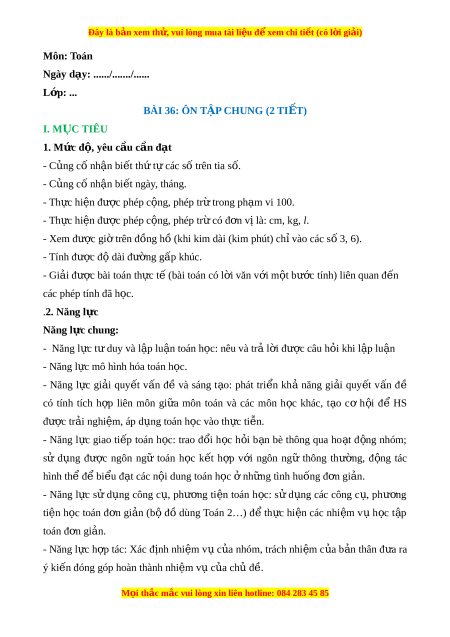 BÀI 36: ÔN TẬP CHUNG (2 TI T Ế ) I. M C Ụ TIÊU 1. Mức đ , ộ yêu c u c ầ n đ ầ t ạ - C ng c ủ ố nh n ậ bi t ế th t ứ các s ự ố trên tia s . ố - C ng c ủ ố nh n ậ bi t ế ngày, tháng. - Th c hi ự n đ ệ ư c ợ phép c ng, phép t ộ r t ừ rong ph m ạ vi 100. - Th c hi ự n đ ệ ư c ợ phép c ng, phép t ộ r có đ ừ n v ơ l ị à: cm, kg, l. - Xem đư c ợ gi t ờ rên đ ng h ồ (
