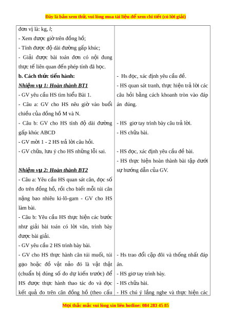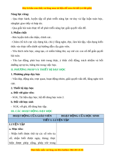 Đây là bản xem th , vu ử i lòng mua tài li u ệ đ xe ể m chi ti t ế (có l i ờ gi i ả ) Năng l c ri ự êng: - Qua th c ự hành, luy n ệ t p ậ sẽ phát tri n ể năng l c ự tư duy và l p ậ lu n ậ toán h c, ọ năngl c ự giao ti p và h ế p t ợ ác. - Qua gi i ả bài toán th c t ự s ế phát ẽ tri n năng l ể c gi ự i ả quy t ế v n đ ấ . ề 3. Phẩm ch t ấ - Rèn luy n t ệ ính c n t ầ h n, chí ậ nh xác. - Chăm ch t ỉ ích c c ự xây d ng bài ự , chú ý l ng ắ nghe, đ c, l ọ àm bài t p, ậ v n d ậ ng ụ ki n ế th c ứ vào th c t ự i n d ễ ư i ớ sự hư ng d ớ n c ẫ a ủ giáo viên. - Yêu thích môn h c, ọ sáng t o, ạ có ni m ề h ng ứ thú, say mê các con s ố đ ể gi i ả quy t ế bài toán. - Yêu lao đ ng, ộ phát huy tính trung th c, ự ý th c ứ chủ đ ng, ộ trách nhi m ệ và b i ồ dư ng ỡ s t ự t ự in, h ng t ứ hú trong vi c h ệ c. ọ II. PHƯ N Ơ G PHÁP VÀ THI T Ế B D Ị Y Ạ H C Ọ 1. Phư ng ơ pháp d y h ạ c ọ - Vấn đáp, đ ng não, t ộ r c quan, ho ự t ạ đ ng nhóm ộ , gi i ả quy t ế v n đ ấ , l ề ng ắ nghe tích c c. ự 2. Thi t ế b d ị y h ạ c ọ a. Đ i ố v i ớ giáo viên: - SGK, Tài li u d ệ y h ạ c, ọ b đ ộ dùng h ồ c ọ toán 2. b. Đ i ố v i ớ h c s ọ inh - SGK, v ghi ở , đ dùng h ồ c t ọ p. ậ III. CÁC HO T Ạ Đ N Ộ G D Y Ạ H C Ọ HOẠT Đ N Ộ G C A Ủ GIÁO VIÊN HOẠT Đ N Ộ G C A Ủ H C Ọ SINH TI T Ế 1: LUY N Ệ T P Ậ LUYỆN T P Ậ a. Mục tiêu: - Nh n ậ bi t ế đư c