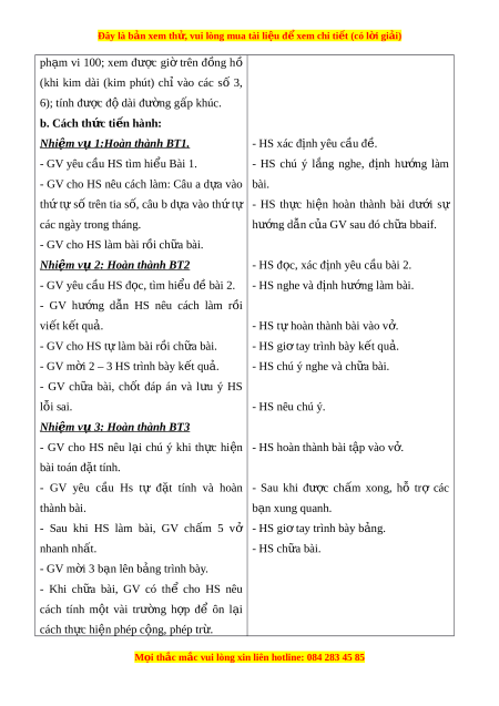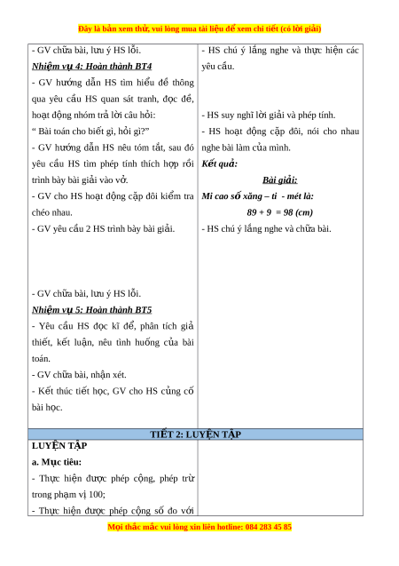 ụ : Hoàn thành BT5 - Yêu c u ầ HS đ c ọ kĩ đ , ể phân tích giả thi t ế , k t ế lu n, ậ nêu tình hu ng ố c a ủ bài toán. - GV ch a ữ bài, nh n xét ậ . - K t ế thúc ti t ế h c, ọ GV cho HS c ng ủ cố bài h c. ọ TI T Ế 2: LUY N Ệ T P Ậ LUYỆN T P Ậ a. Mục tiêu: - Th c ự hi n ệ đư c ợ phép c ng, ộ phép trừ trong ph m ạ v 100; ị - Th c ự hi n ệ đư c ợ phép c ng ộ số đo v i ớ M i ọ thắc m c