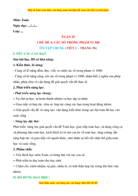 Giáo án Ôn tập chung (Trang 96) Toán lớp 2 Cánh diều