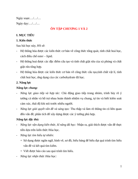 ÔN TẬP CHƯƠNG 1 VÀ 2 I. MỤC TIÊU 1. Kiến thức Sau bài học này, HS sẽ:
