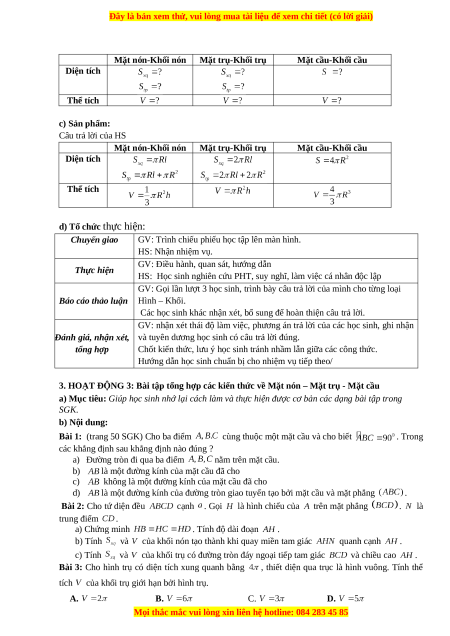 Mặt cầu-Khối cầu Diện tích Thể tích c) Sản phẩm: Câu trả lời của HS Mặt nón-Khối nón