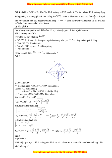 c) Khối trụ tạo thành có: Bài 3: Đáp án là