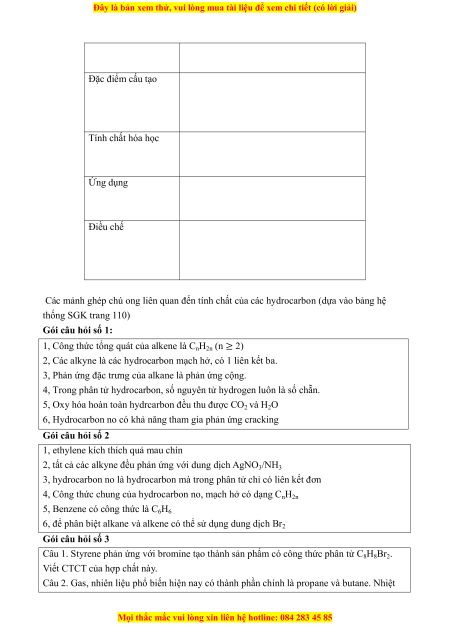 Đây là bản xem thử, vui lòng mua tài liệu để xem chi tiết (có lời giải) Đặc điểm cấu tạo Tính chất hóa học Ứng dụng Điều chế