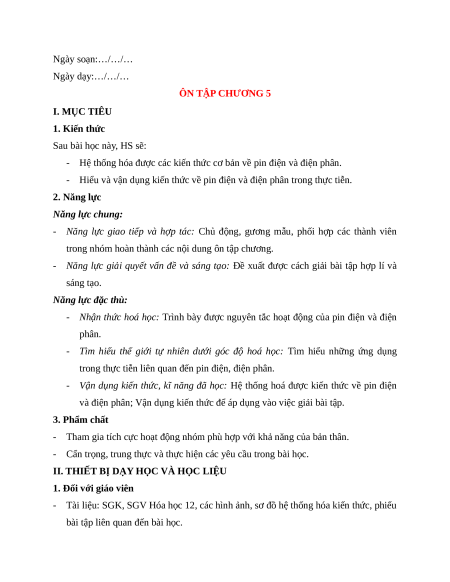 Ngày soạn:…/…/… Ngày dạy:…/…/… ÔN TẬP CHƯƠNG 5 I. MỤC TIÊU 1. Kiến thức Sau bài học này, HS sẽ: