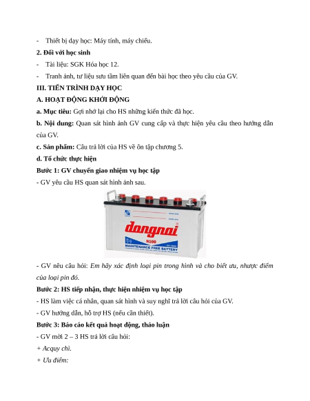 - GV nêu câu hỏi: Em hãy xác định loại pin trong hình và cho biết ưu, nhược điểm của loại pin đó.