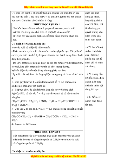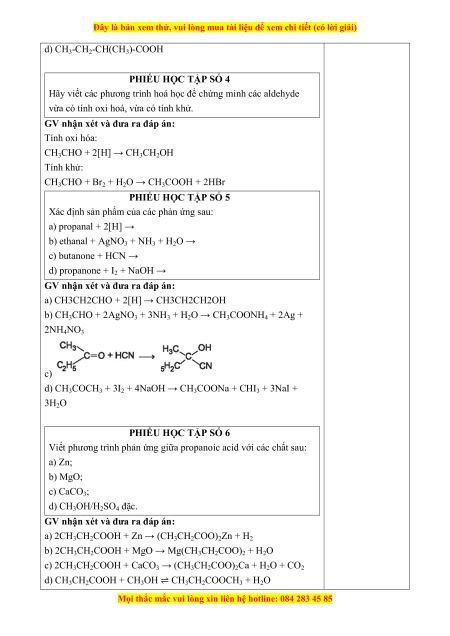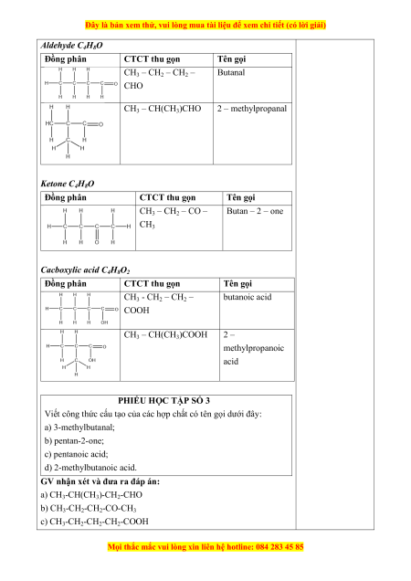 Đây là bản xem thử, vui lòng mua tài liệu để xem chi tiết (có lời giải) Aldehyde C4H8O Đồng phân CTCT thu gọn Tên gọi CH3 – CH2 – CH2 – Butanal CHO CH3 – CH(CH3)CHO 2 – methylpropanal Ketone C4H8O Đồng phân CTCT thu gọn Tên gọi CH3 – CH2 – CO – Butan – 2 – one CH3 Cacboxylic acid C4H8O2 Đồng phân CTCT thu gọn Tên gọi CH3 - CH2 – CH2 – butanoic acid COOH CH3 – CH(CH3)COOH 2 – methylpropanoic acid PHIẾU HỌC TẬP SỐ 3