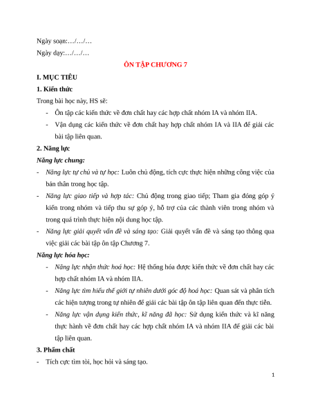 - Vận dụng các kiến thức về đơn chất hay hợp chất nhóm IA và IIA để giải các bài tập liên quan. 2. Năng lực