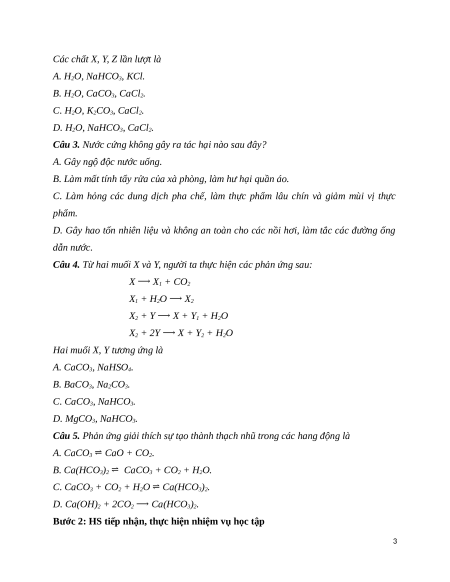 Các chất X, Y, Z lần lượt là A. H2O, NaHCO3, KCl. B. H2O, CaCO3, CaCl2. C. H2O, K2CO3, CaCl2. D. H2O, NaHCO3, CaCl2.