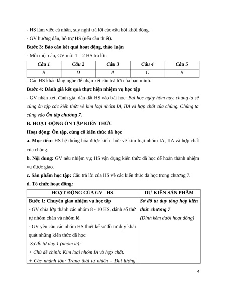 a. Mục tiêu: HS hệ thống hóa được kiến thức về kim loại nhóm IA, IIA và hợp chất của chúng.