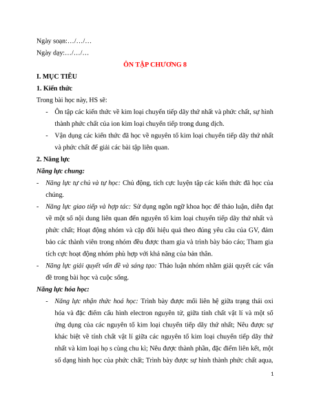 - Ôn tập các kiến thức về kim loại chuyển tiếp dãy thứ nhất và phức chất, sự hình