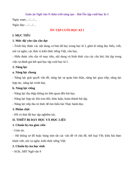 Giáo án Ôn tập cuối học kì 1 (2024) Ngữ Văn 9 Chân trời sáng tạo