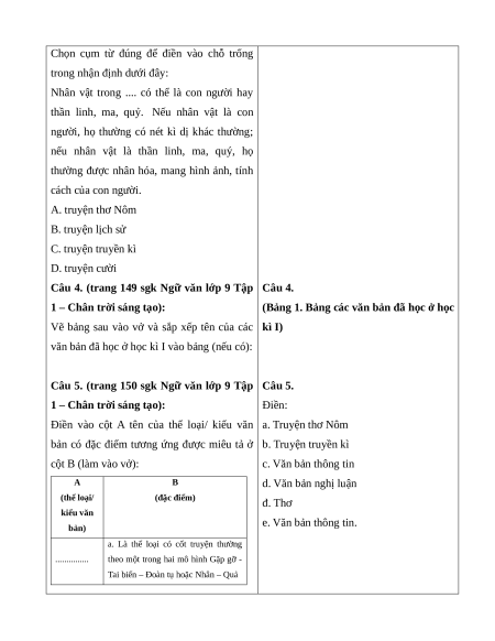 bản có đặc điểm tương ứng được miêu tả ở b. Truyện truyền kì cột B (làm vào vở): c. Văn bản thông tin A B d. Văn bản nghị luận (thể loại/ (đặc điểm) đ. Thơ kiểu văn e. Văn bản thông tin. bản)
