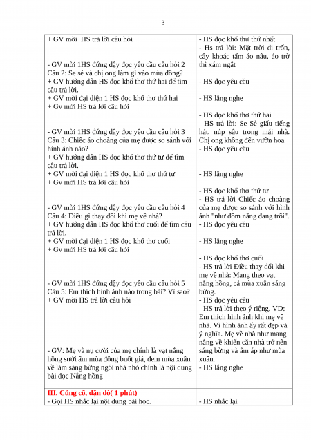 - Đọc hiểu và trả lời câu hỏi về nội dung bài đọc Nắng hồng 2. Năng lực chung.