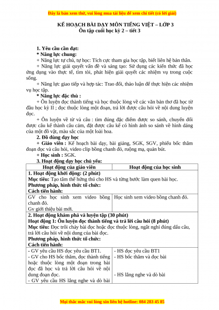 KẾ HOẠCH BÀI DẠY MÔN TIẾNG VIỆT – LỚP 3