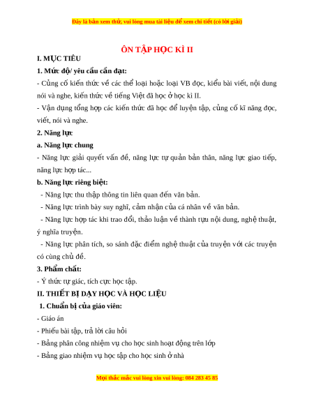 ử vui lòng mua tài li u ệ đ ể xem chi ti t ế (có l i ờ gi i ả ) ÔN T P Ậ H C Ọ KÌ II I. M C Ụ TIÊU 1. Mức đ / ộ yêu c u c ầ n đ ầ t ạ : - C ng ủ cố ki n ế th c ứ về các thể lo i ạ ho c ặ lo i ạ VB đ c, ọ ki u ể bài vi t ế , n i ộ dung nói và nghe, ki n ế th c v ứ t ề i ng ế Vi t ệ đã h c ọ ở h c kì ọ II. - V n ậ d ng ụ t ng ổ h p ợ các ki n ế th c ứ đã h c ọ để luy n ệ t p, ậ c ng ủ cố kĩ năng đ c, ọ vi t ế , nói và nghe. 2. Năng l c ự a. Năng l c chung ự - Năng l c ư gi i a quy t ế v n â đ , ề năng l c ư t ư qu n a b n a thân, năng l c ư giao ti p, ế năng l c ư h p t ợ ác... b. Năng l c ri ự êng bi t ệ : - Năng lưc thu th p ậ thông tin liên quan đ n ế văn ban.