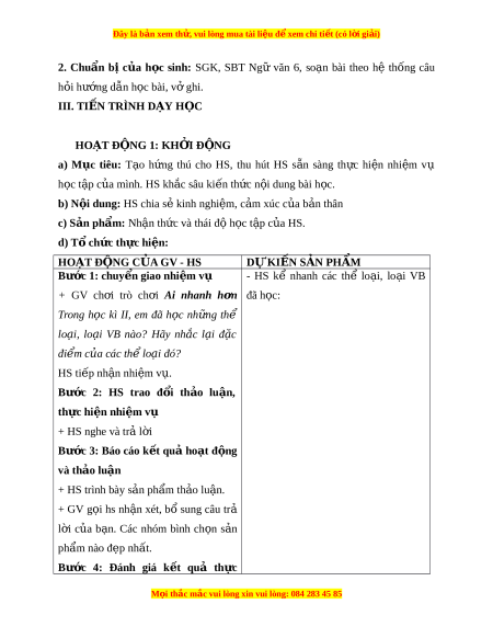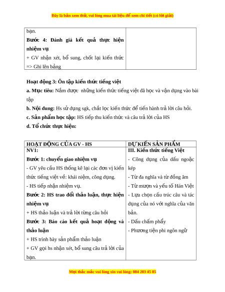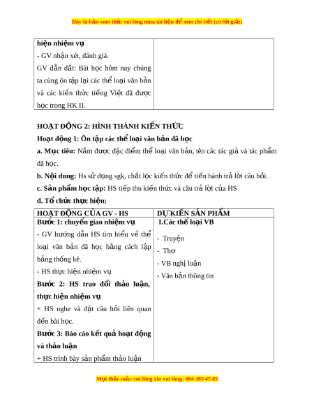 ử vui lòng mua tài li u ệ đ ể xem chi ti t ế (có l i ờ gi i ả ) hi n nhi ệ m ệ vụ - GV nh n xét ậ , đánh giá. GV d n ẫ d t ắ : Bài h c ọ hôm nay chúng ta cùng ôn t p ậ l i ạ các th l ể o i ạ văn b n a và các ki n ế th c ứ ti ng ế Vi t ệ đã đư c ợ h c ọ trong HK II. HOẠT Đ N