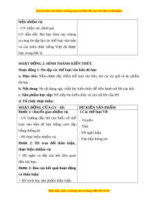 ộ dung: Hs sử d ng s ụ gk, ch t ắ l c ọ ki n t ế h c đ ứ t ể i n hành t ế r l a i ơ câu h i o . c. Sản phẩm h c t ọ p: ậ HS ti p t ế hu ki n t ế h c và ứ câu tr l a i ơ c a ủ HS d. T ch ổ ức thực hi n: ệ HOẠT Đ N Ộ G C A Ủ GV - HS D K Ự IẾN SẢN PHẨM Bư c ớ 1: chuy n gi ể ao nhi m ệ vụ I.Các th l ể oại VB - GV hư ng ớ d n ẫ HS tìm hi u ể về thể - Truyện lo i ạ văn b n a đã h c ọ b ng ằ cách l p ậ - Thơ b ng a thống kê. - VB nghị lu n ậ - HS th c hi ư n nhi ệ m ệ vụ - Văn b n a thông tin Bư c ớ 2: HS trao đ i ổ th o ả lu n, ậ thực hi n nhi ệ m ệ vụ + HS nghe và đ t ặ câu h i o liên quan đ n bài ế h c. ọ Bư c ớ 3: Báo cáo k t ế qu ả ho t ạ đ ng ộ và thảo luận + HS trình bày s n a ph m ẩ th o a lu n ậ M i ọ th c ắ m c