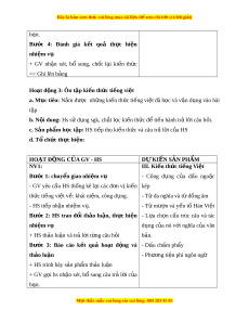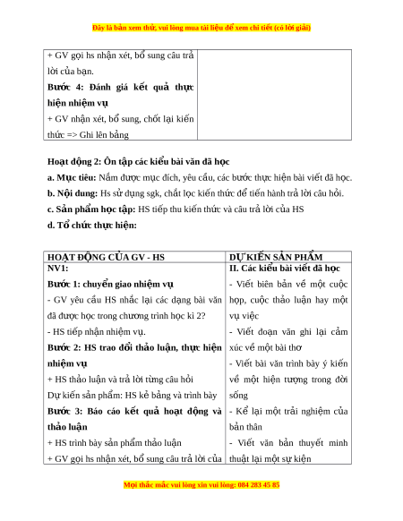 ử vui lòng mua tài li u ệ đ ể xem chi ti t ế (có l i ờ gi i ả ) + GV g i ọ hs nh n ậ xét, b ổ sung câu tra l i ơ c a ủ b n. ạ Bư c ớ 4: Đánh giá k t ế quả th c ự hi n nhi ệ m ệ vụ + GV nh n ậ xét, bổ sung, ch t ố l i ạ ki n ế th c ứ => Ghi lên b ng a Hoạt đ ng 2 ộ : Ôn t p các ki ậ u bài ể văn đã h c ọ a. Mục tiêu: N m ắ đư c m ợ c ụ đích, yêu c u, các b ầ ư c ớ th c hi ư n bài ệ vi t ế đã h c. ọ b. N i