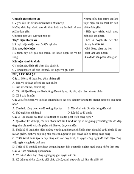 - Đánh giá công nghệ: Đưa ra đánh giá, nhận xét về quy trình thiết kế một số sản phẩm