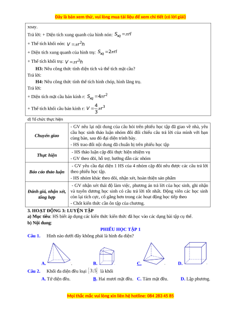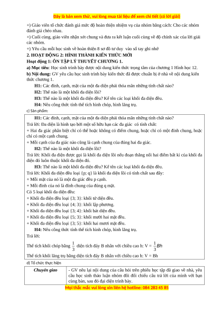 H4: Nêu công thức tính thể tích hình chóp, hình lăng trụ. c) Sản phẩm: