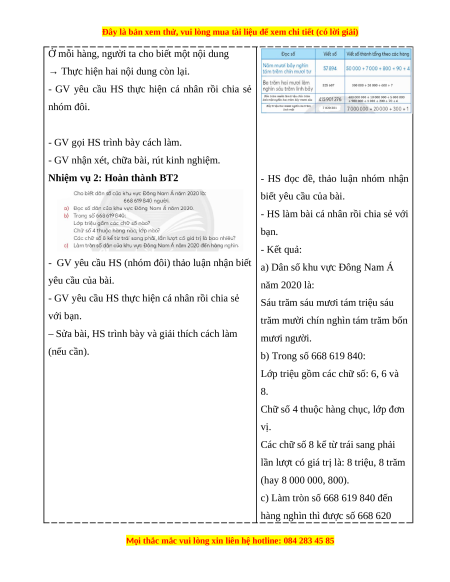 - GV yêu cầu HS (nhóm đôi) thảo luận nhận biết a) Dân số khu vực Đông Nam Á yêu cầu của bài. năm 2020 là: