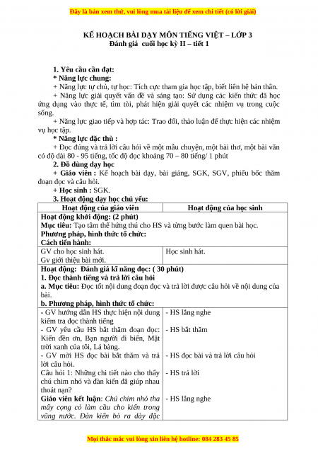 KẾ HOẠCH BÀI DẠY MÔN TIẾNG VIỆT – LỚP 3